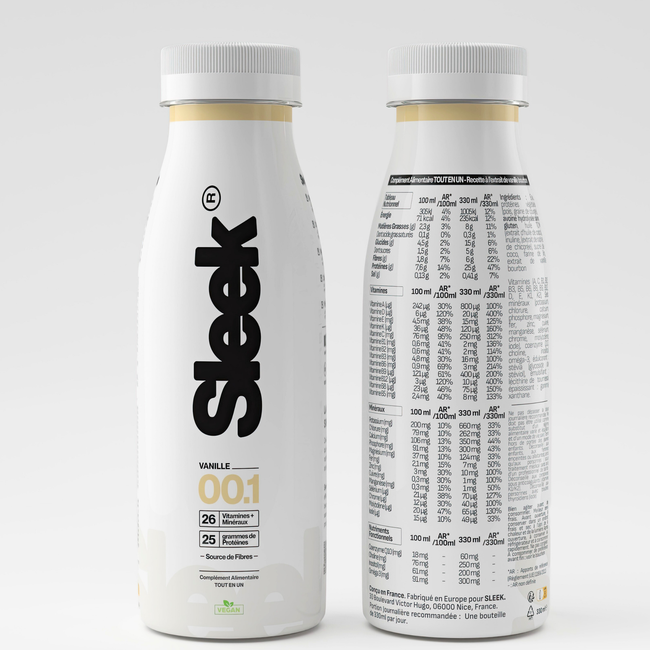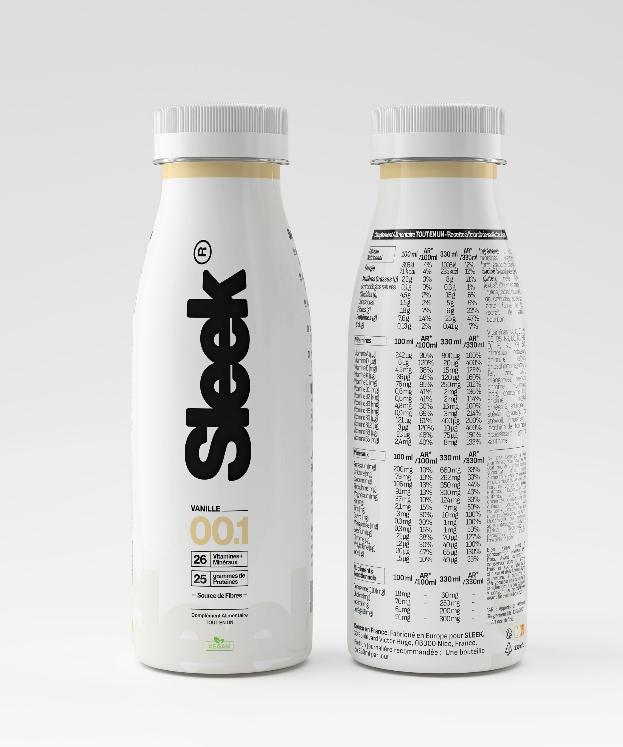 Sleek est enfin conçu en Septembre 2025 ! Sans additif à risque, sans allergène, et surtout, le tableau nutritionnel le plus complet au monde. Mais conçu ne veut pas dire produit - on devra attendre 8 mois avant le début de la production, car certaines vitamines sont difficiles à sourcer. Pas facile d'avoir de grandes quantités de Coenzyme Q10, d'oméga 3, ou encore de Sélénium.
